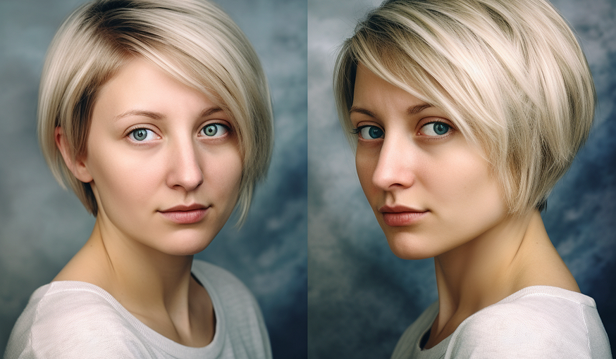 - Поворот плеч придаст объема нижней части лица. Боковые пряди зрительно уменьшают лоб.