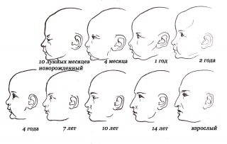 - До 7 лет отмечается равномерный и энергичный рост головы. До трехлетнего возраста происходит формирование задней части. В период появления молочных зубов начинает формироваться лицевая часть. Рисунок профиля становится более выраженным, слегка выдвигается челюсть. К семи годам голова вырастает до размера, который свойственен взрослому человеку.