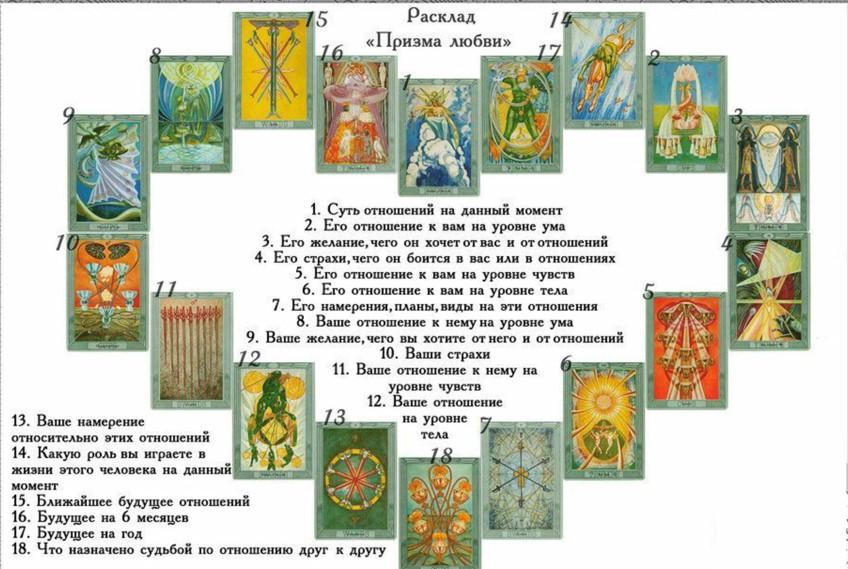 Расклад «Призма любви» поможет сделать полный анализ отношений между мужчиной и женщиной – как избранник относится к вопрошающему, какие чувства испытывает, его планы. Всего 18 аспектов.