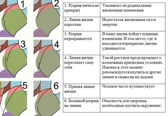 Разрыв, прерывающий линию жизни, хиромантами не считается фатальным знаком. Существует несколько видов обрывов и тенденций в поведении жизненной нити после них. Прерывистость полосы трактуется как знак судьбоносных перемен, соответствующих возрастному отрезку, указанному на вашей ладони.