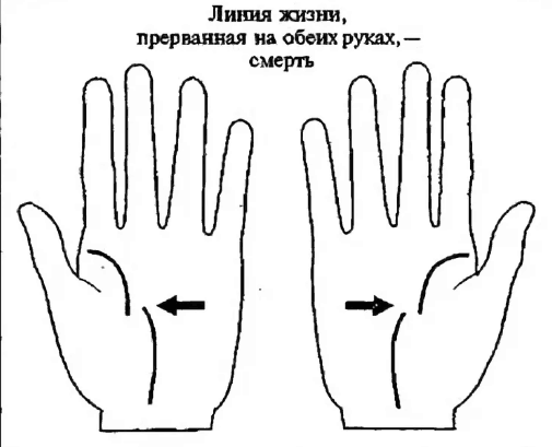 Прежде чем перейти к описанию последствий разного рода обрывов линии жизни, следует отметить, что обрыв не следует понимать буквально. Это не обязательно указание на смерть примерно в определенном возрасте. След четко обозначенного разрыва предупреждает о серьезных жизненных состояниях, которые могут повлиять на продолжительность земного существования: