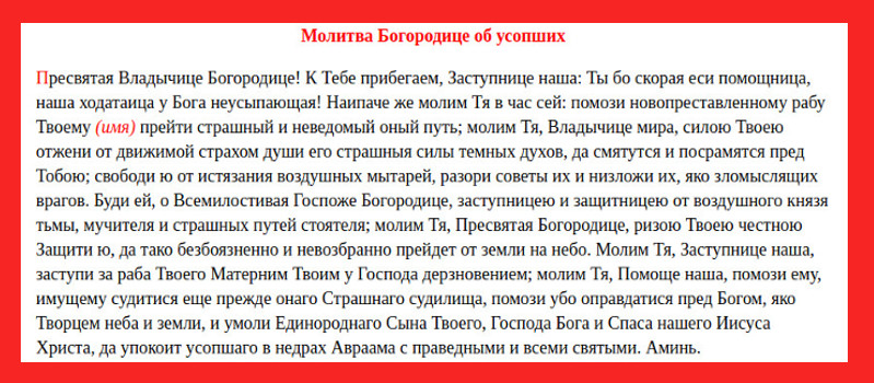 Господи Иисусе Христе Боже наш! Ты хранитель сирот, прибежище скорбящих и утешитель плачущих. К тебе обращаюсь, сирота, стеная и плача, и молю тебя: услышь молитву мою и не отврати лица Твоего от воздыхания сердца моего и от слез очей моих. Молю Тебя, милостивый Господи, утоли мою скорбь разлуки с моим родителем (выпуском) моим (-её) (имя), его душой (её), яко он (-ы) шёл к Тебе с истинной верой в Тебя и твердое упование на человеколюбие и милость Твою приими в Царствие Небесное Твое. Преклоняюсь перед Твоей святой волей, она у меня уже взята, и прошу Тебя, не отнимай у него (неё или их) Твоего милосердия и милости. Знаем, Господи, яко Ты Судия мира сего, накажи грехи и злодеяния отцов в детях, внуках и правнуках, до третьего и четвертого рода: но и отцов помилуй за молитвы и достоинства своих детей, внуков и правнуков. С угрызениями совести и умилением сердечным молю тебя, милостивый судия, не накажи вечным наказанием усопшего (е) незабвенного (е) для меня, твоего раба (е) (е), моего родителя (матери) (с)) (имя), но прости ему (ей) все грехи его (её), вольные и невольные, словом и делом, по знанию и неведению, сотворённому им (ею) в его (её) жизни здесь, на земле, и согласно Твое милосердие и человеколюбие, молитвы ради пречистыя Богородицы и всех святых, помилуй его (ю) и терпи вечные муки. Ты, милостивый отец отцов и детей! Дай мне, во все дни жизни моей, до последнего вздоха моего, не переставая поминать в молитвах своих усопшего родителя (матери) моего (ее), и просить Тебя, праведный судия, и положить его (ее) в место для света, в месте прохладном и в месте мира, со всеми святыми, ниоткуда убежит всякая болезнь, печаль и воздыхание. Милосердный Господь! Приими же днесь о рабе Твоем (Твоем) (имя) сию теплую молитву от меня и дай ему (ей) награду Твою за труды и попечение о воспитании моем в вере и христианском благочестии, как будто он научил меня прежде всего руководить Тобой , Господь твой, моли Тебя с благоговением, уповай на Тебя одного в проблемах, печалях и болезнях и соблюдай Твои заповеди; за его (ее) благополучие о моих душевных успехах, за теплоту молитв, которые он (она) приносит о мне за вас и за все дары, которые он (она) просил у меня от вас, наградите его (ее) Своей милостью , Ваши небесные благословения и радость в вашем вечном Царстве. Ты Бог милосердия, щедрости и человеколюбия. Ты мир и радость верных рабов Твоих, и славу Тебе возсылаем со Отцем и Святым Духом, ныне и присно, и во веки веков. Аминь.