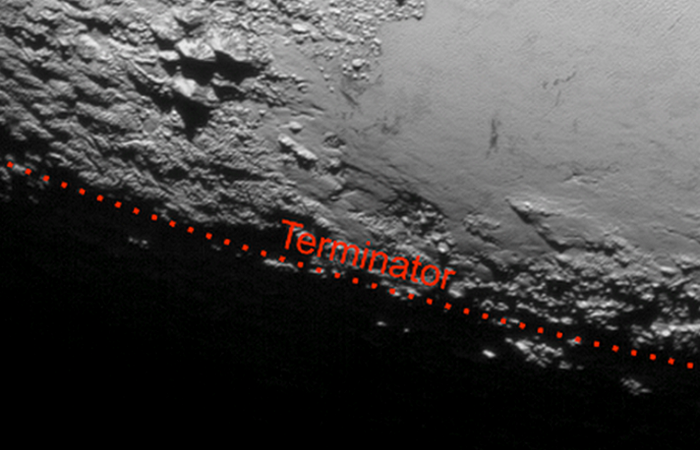 Яркая дымка в атмосфере Плутона производит мягкий полусумрак, который освещает поверхность до восхода и после захода солнца.