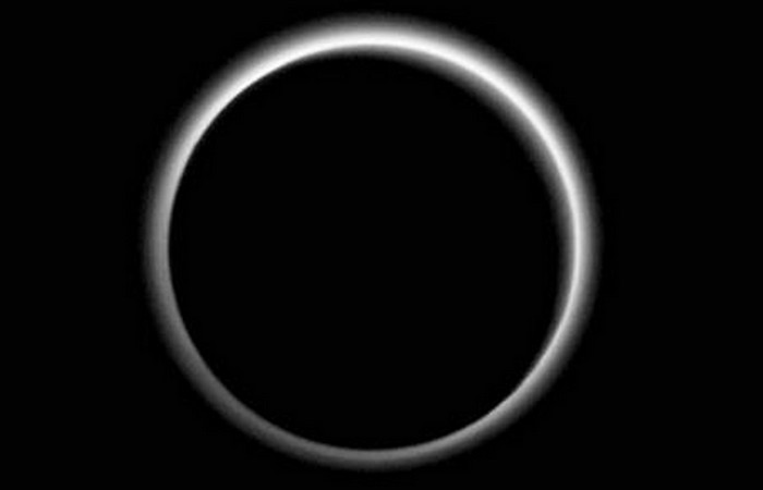 Светящаяся на фоне Солнца атмосфера Плутона, окружающая карликовую планету. На этом снимке, полученном с помощью космического аппарата New Horizons, атмосфера выглядит как настоящее гало.