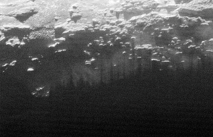 New Horizons обнаружила новый, по-видимому, менее возвышенный горный хребет на нижнем левом краю самой известной «фишки» Плутона – ледяных гор.