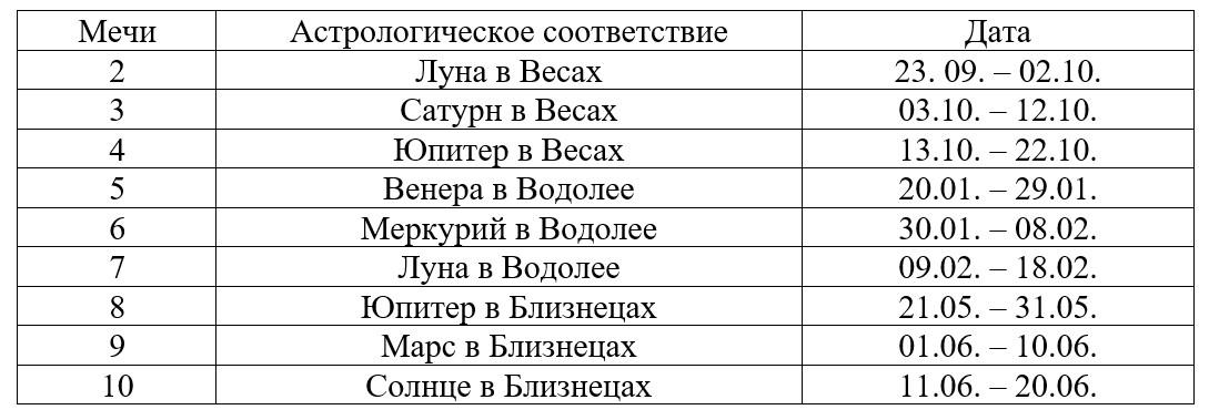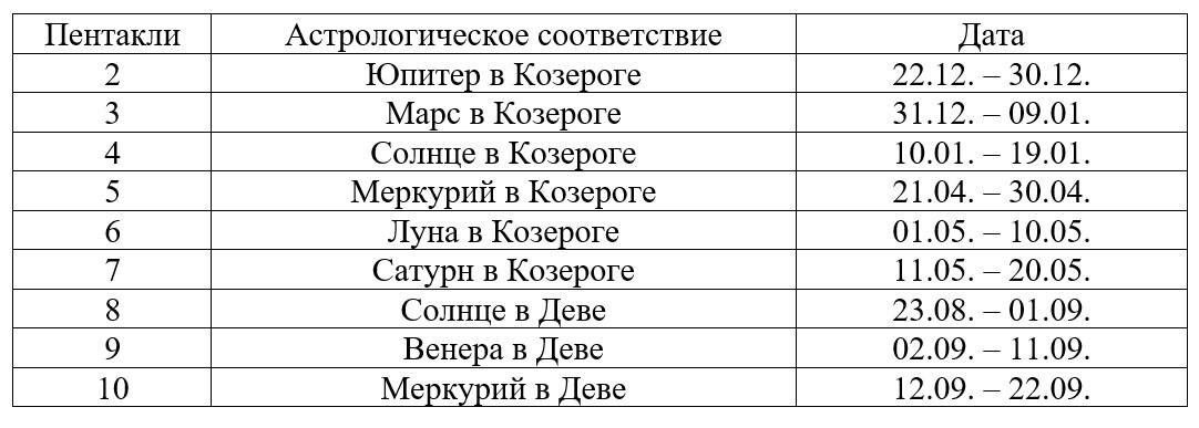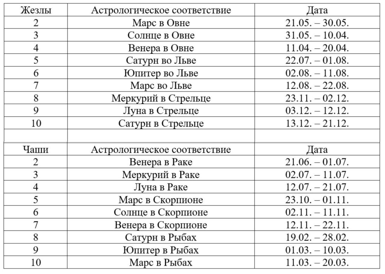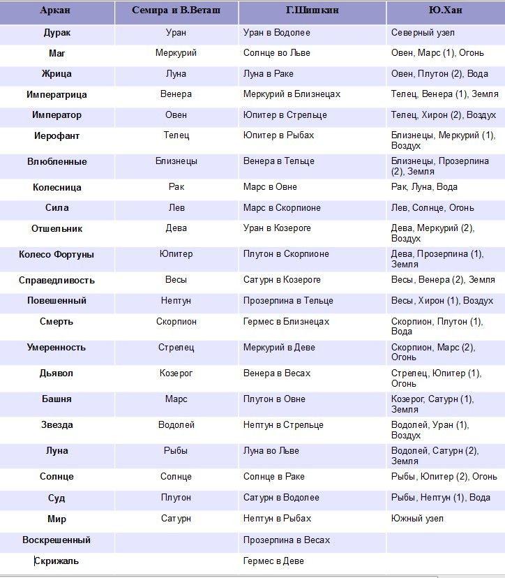 Таблица астрологических соответствий карт Таро Ю. Хана