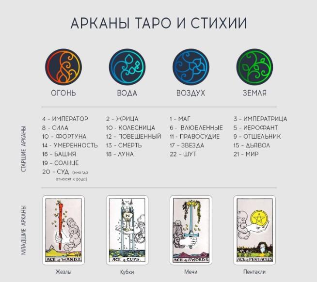 Распределение символов Таро по зодиакальным знакам и стихиям