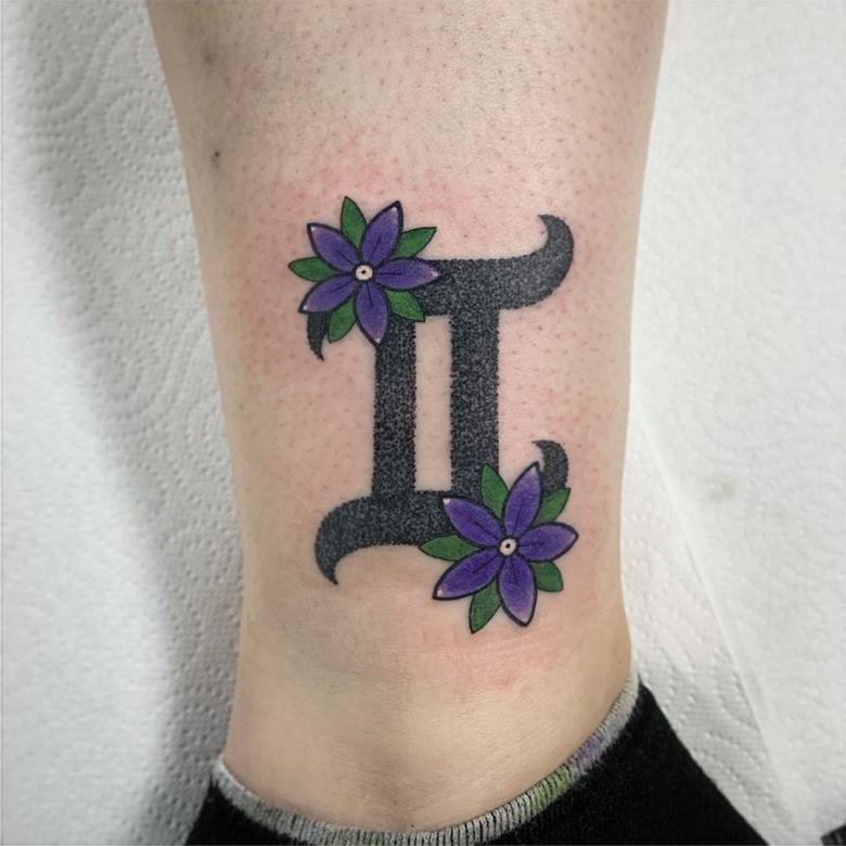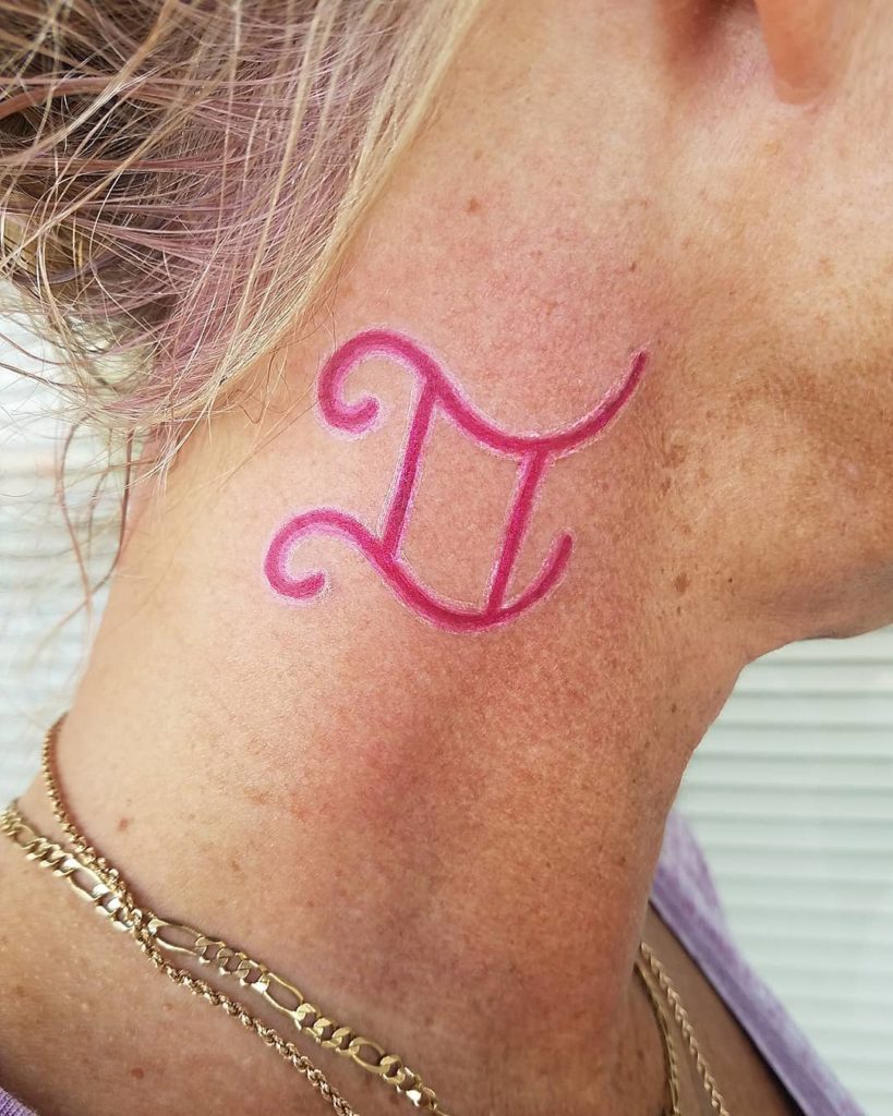 Красочная татуировка, содержащая символ знака зодиака в окружении ярких и привлекательных цветов, выглядит очень женственно и необычно. Это один из лучших дизайнов татуировок для женщин. Татуировка на шее Близнецов будет выглядеть лучше всего, особенно если вы выберете насыщенные цвета, такие как синий, фиолетовый, розовый, оранжевый и черный.