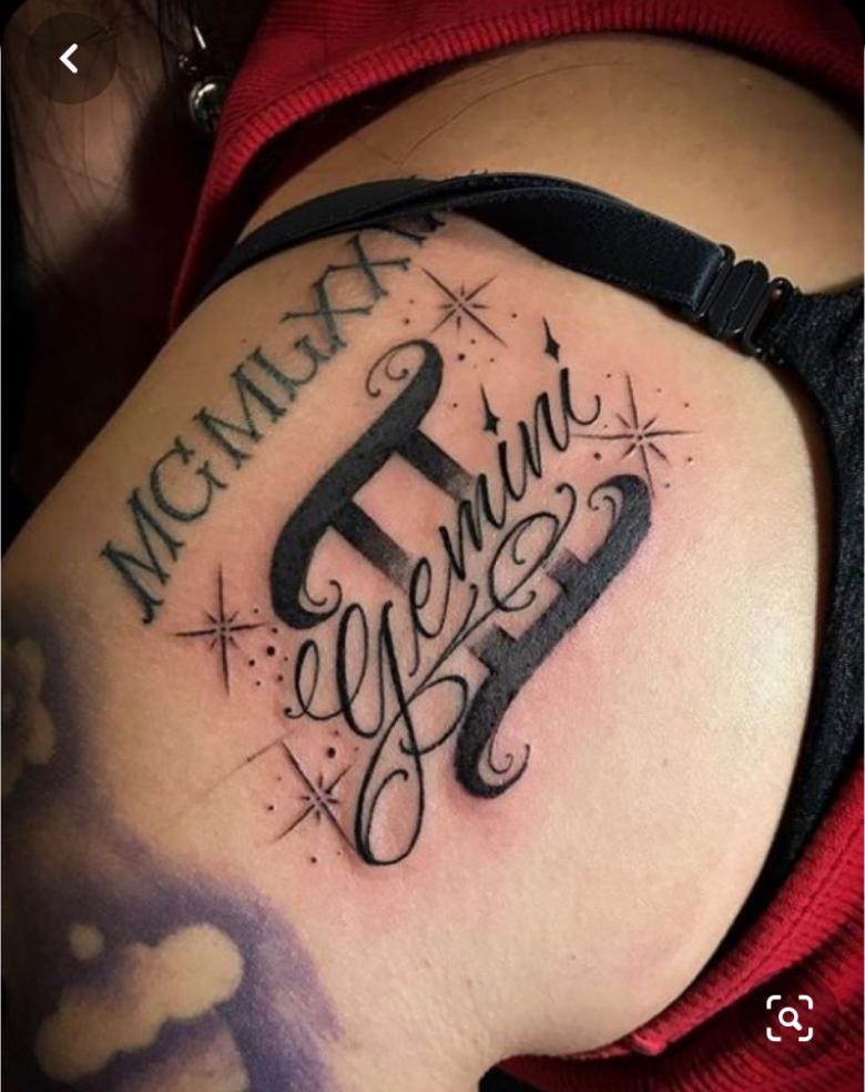 Есть много идей для украшения тела. Базовый вариант – тату с созвездием или знаком Близнецы. Красиво смотрится, легко вписывается в небольшие картинки, которые можно заполнить всего за один визит к мастеру.