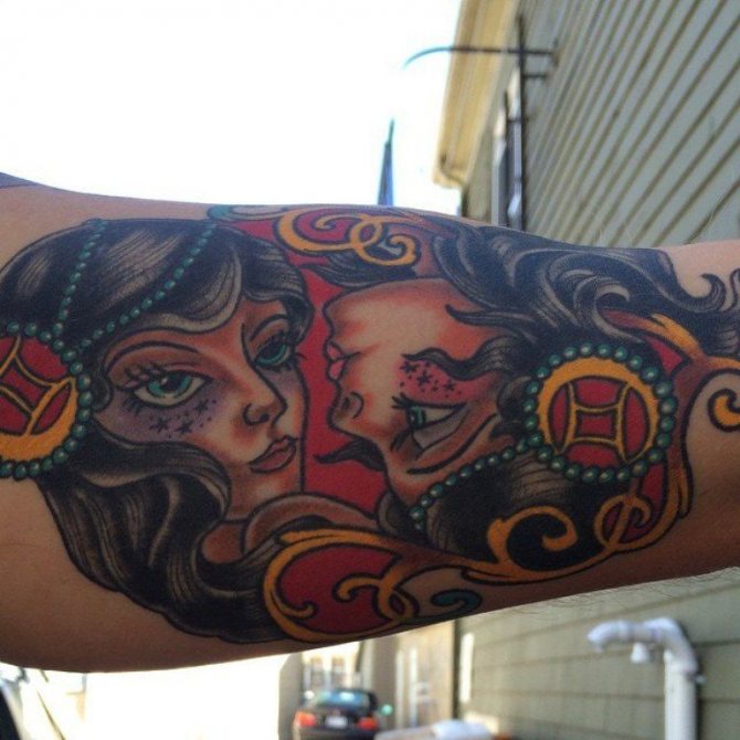 Толкование татуировки Близнецы тесно связано с влиянием знака зодиака на человека. Татуировка с изображением лиц может указывать на двойственность носителя, либо показывать его гармоничный характер. Популярен образ двух скрещенных столбов, олицетворяющих вход в мир самосовершенствования.
