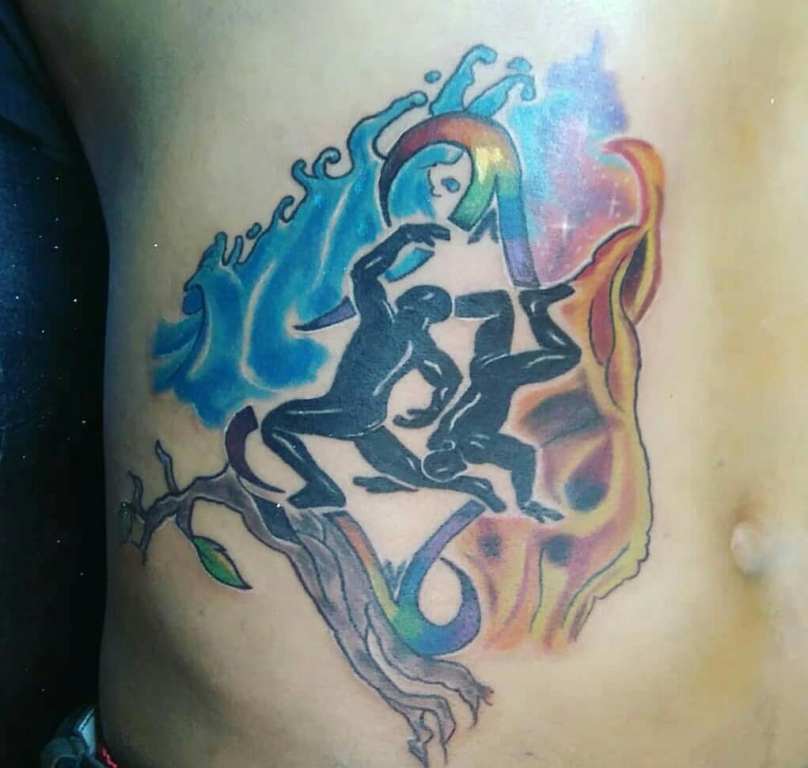 Эта татуировка показывает ассимиляцию двух совершенно разных стихий огня и воды. Голубые брызги от волн, а языки пламени, изображенные в оттенках оранжевого и желтого, выглядят по-настоящему свежо, интересно и привлекательно.