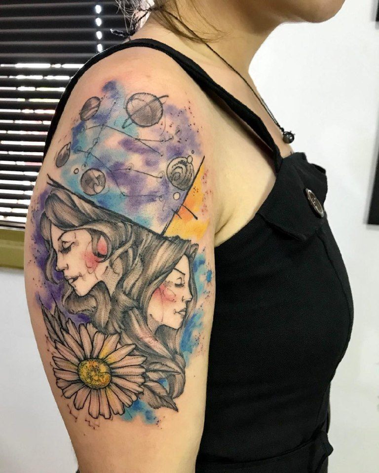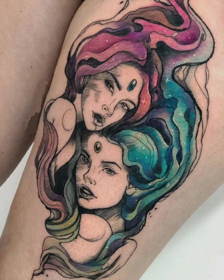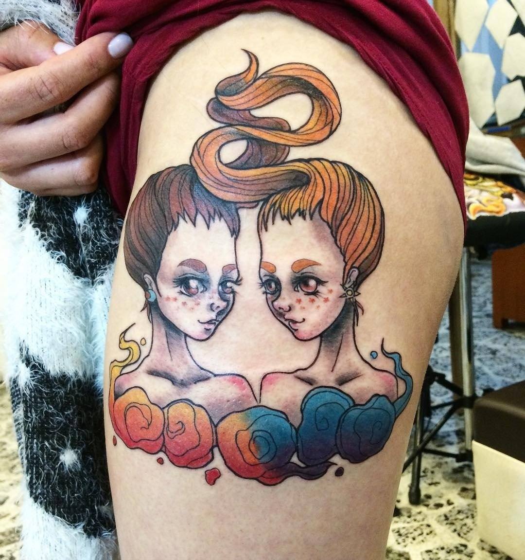 Тату со звездами и луной выглядит очень нежно и необычно. Цветовые сочетания представлены таким образом, что кажется, будто от татуировки исходит особое свечение. Тату идеально подойдет женщинам, которые любят мечтать и витать в облаках. Знак Близнецов лучше всего выглядит в ярких цветах, таких как синий, фиолетовый, черный и розовый.