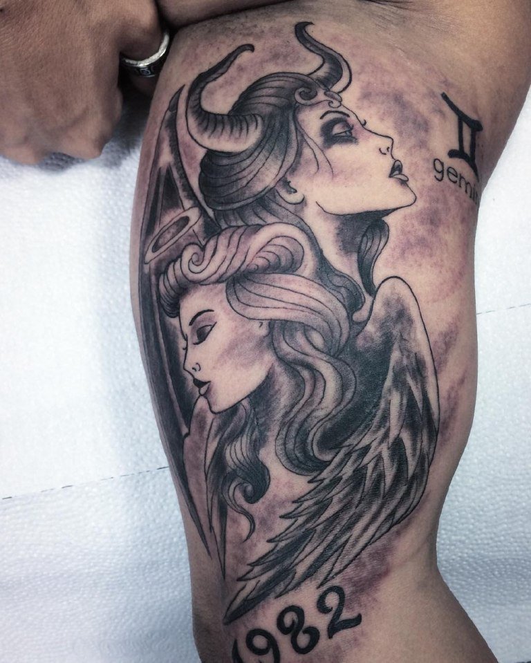 Подходит для тех, кто хочет спрятать боди-арт от посторонних. Созвездие Близнецов используется в тату как полноценный рисунок. Этот шедевр производит положительное впечатление.