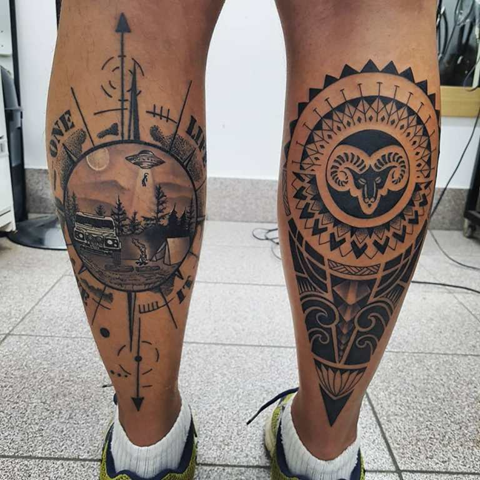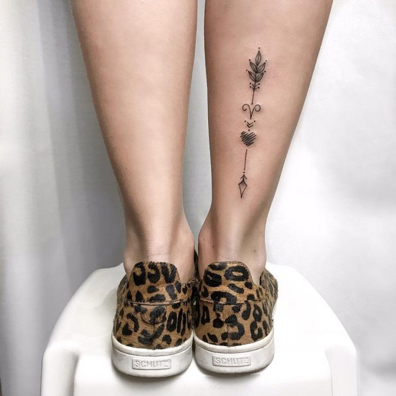 Большим преимуществом нанесения тату в этом месте является безболезненность, так как в этих местах нет костей и мало нервных окончаний. Если девушка готова терпеть своеобразные болевые ощущения в передней части ноги (голени), можно использовать любое изображение Овна на обеих ногах.