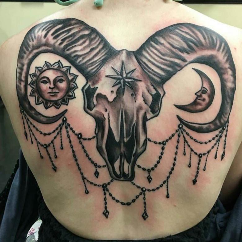 Тату Овен для девушек способна подчеркнуть сильный характер и жестокость, украшенная черно-белым черепом. Для придания мягкости и консистенции используется акварельный метод. Сегодня популярны такие стили, как дотворк, графика и минимализм. Особенно интересно и ярко смотрится цветная татуировка Овна, которая находится в зодиаке.