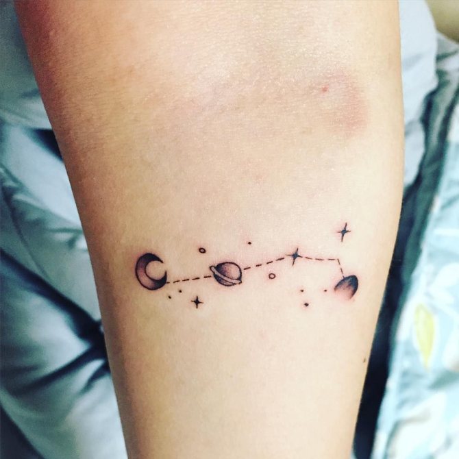 Созвездие — хорошая идея для татуировки. Этот дизайн идеально подходит для ношения на запястье или спине для девочек. Мужские татуировки более привлекательно смотрятся на руке или на шее сбоку.