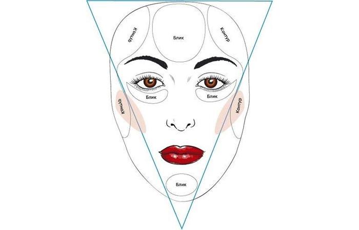 У женщин с треугольным лицом лоб — самая широкая часть, линия глаз немного уже, а челюсть/подбородок — самая узкая. Если мысленно нарисовать силуэт такого лица, он будет похож на перевернутый треугольник.